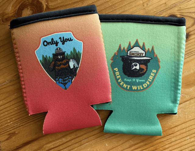 New designs - two options! Green: "Keep it Green, Prevent Wildfires" and Orange: "Only You". Rubberized fabric with bottom. Helps keep beverage cold while being held.Â